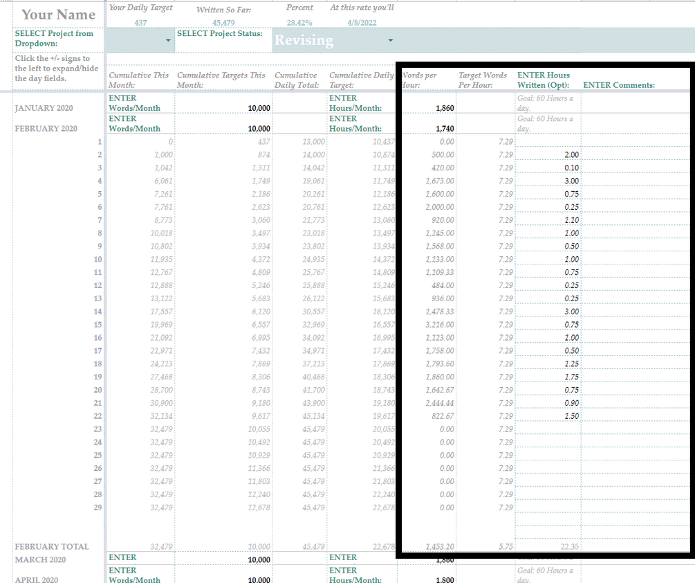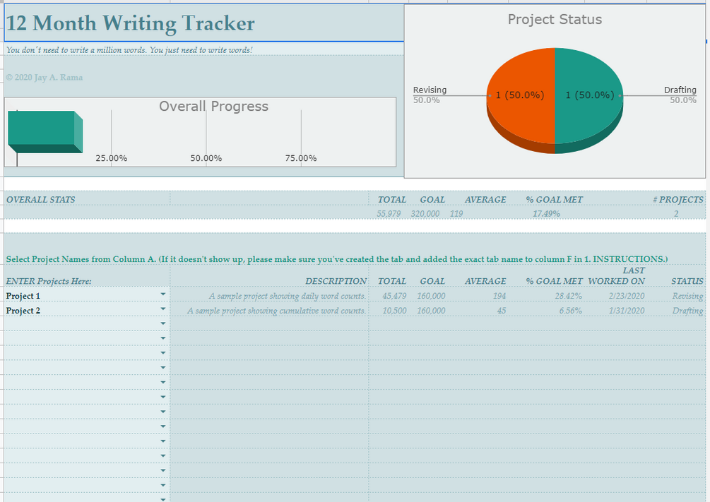 Tracks word count, time, and goals for multiple projects over 12 months, and shows NaNoWriMo-style graphs and statistics to help you stay on track! The sheet allows you to log daily word counts and time spent writing for each day of the year across multiple creative projects on a daily or cumulative basis . You can set your own custom 12 month period as well. You can also enter your word count and time goals separately for each project on an overall or month by month basis.